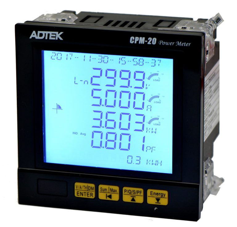CPM-20 multifunction power meter with high accuracy measurement for single phase and three-phase system. Measuring parameters for voltage, current, active/reactive/apparent power and energy, power factor, and frequency etc.. Standard with RS-485 Modbus RTU communication port, front LCD display with buttons for programming. It can display the accumulated CO2 emission for power monitoring and management.